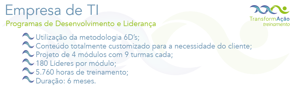 A Transformação Treinamento é um empresa especializada em prestação de serviço de consultoria em desenvolvimento humano e comunicação corporativa, que busca implementar soluções customizadas à necessidade de seu cliente nas áreas de treinamento, desenvolvimento, assessment e coaching.